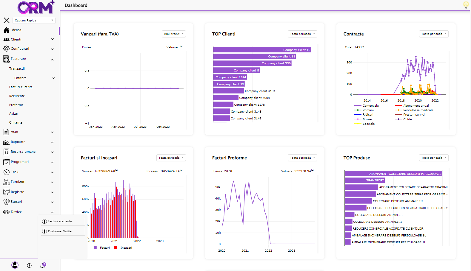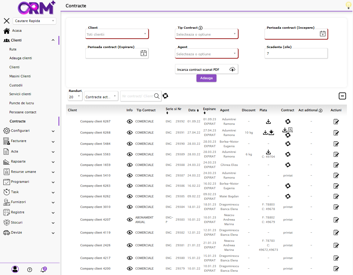 Centralizează cu acest modul toate informațiile despre clienții tăi; Puncte de lucru, Administrare rute, Persoane de contact, Servicii asociate, Contracte (cu generare PDF) și Contracte de custodie. Adăugare clienți cu preluare date de pe ANAF.